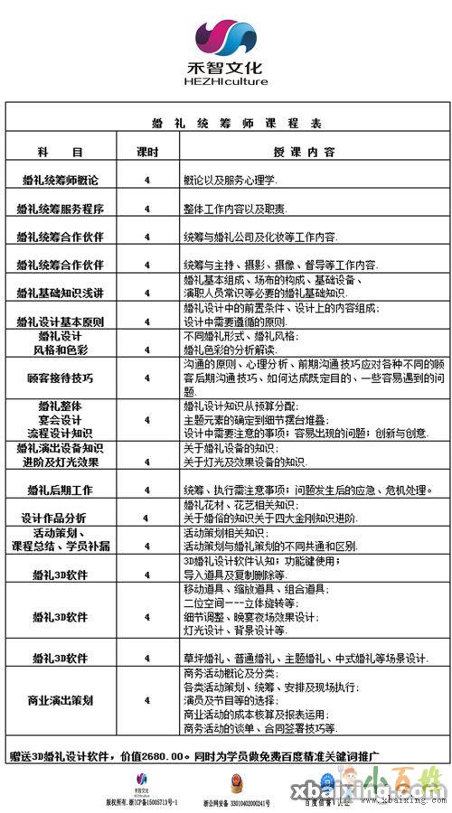 课程内容:婚礼统筹师培训、婚礼策划培训、商业演出策划培训、3D婚礼演出软件的设计与运用,经济发相关知识、财务成本核算、微信平台制作推广、大型搜索引擎客户渠道建立等课程。