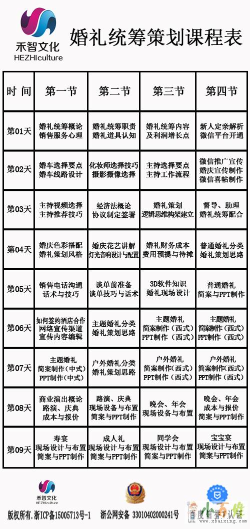 广,互联网建立,财务成本核算,经济法相关知识。以及谈单技巧等。 培训对象:热爱婚礼或演出行业,打算从事婚礼或演出策划师职业的各界朋友们。